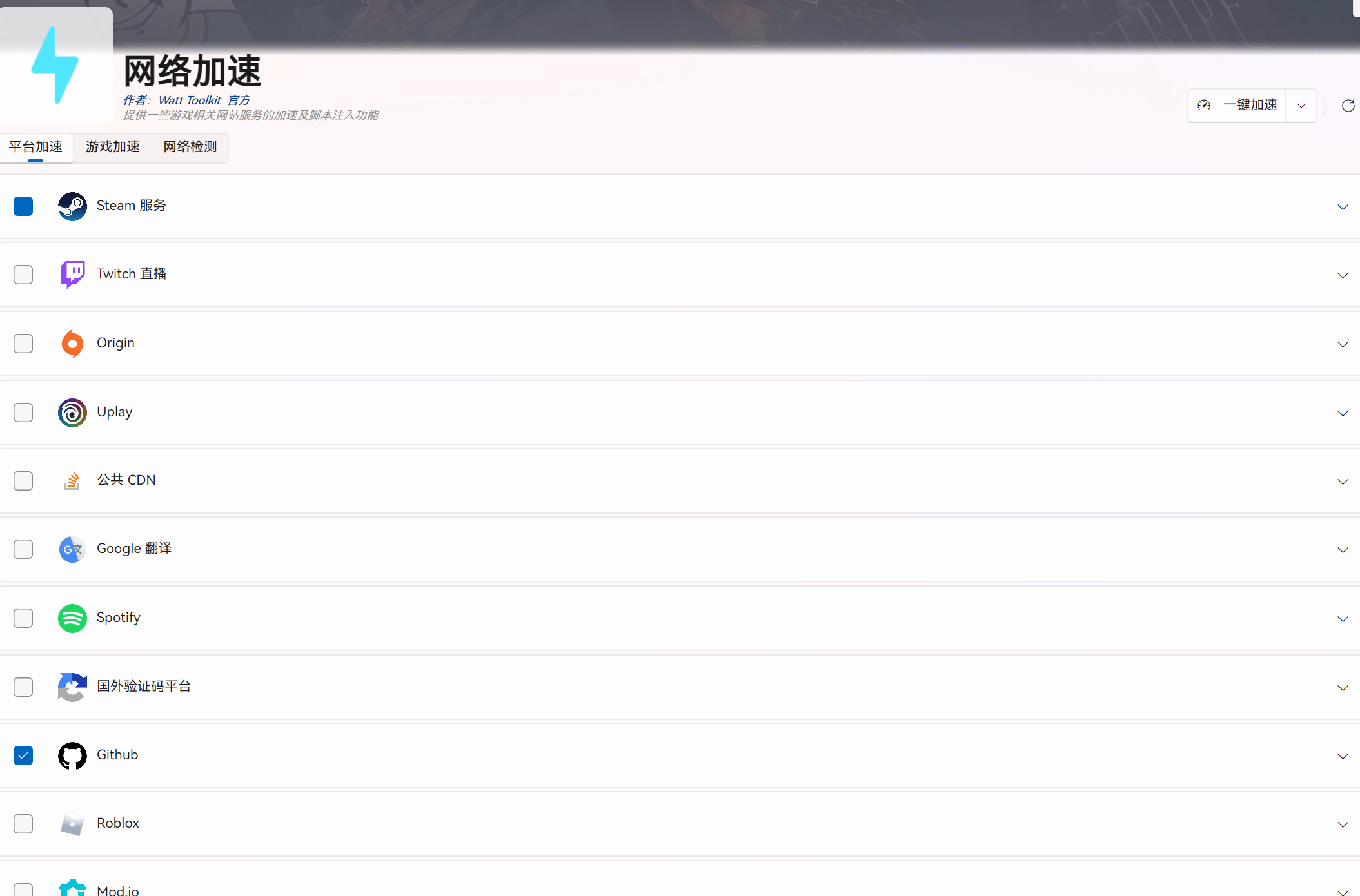 • 在「网络加速」标签页中,勾选需要加速的服务,如Steam、GitHub等